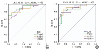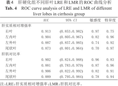 肝硬化组中各个肝叶的LRE、LMR区分ALBI 1级和ALBI 2~3级的ROC曲线分析如表4和图2所示。肝右叶LRE对于鉴别ALBI 1级和ALBI 2~3级准确性最高,AUC值为0.913。