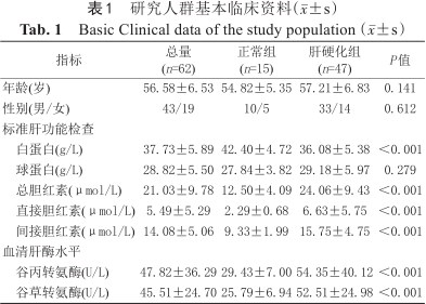 | 指标 | 总量 (n=62) | 正常组 (n=15) | 肝硬化组 (n=47) | P值 |