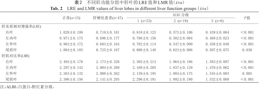 不同肝功能分组中肝叶的LRE值和LMR值(±s)