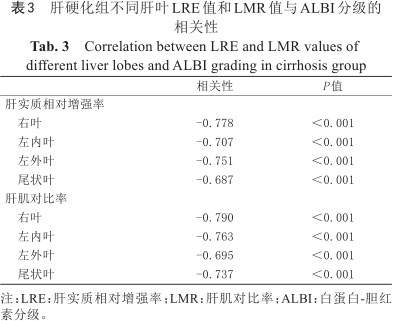 正常组和肝硬化组各个肝叶LRE、LMR如表2所示,根据Kruskal-Wallis秩和检验,正常组和不同ALBI分级组之间各个肝叶的LRE值和LMR值差异有统计学意义(P<0.05)。各组两两比较结果显示各肝叶LRE值在ALBI 2级和ALBI 3级组之间差异无统计学意义(P>0.05),各肝叶LMR值在任意两组之间差异均有统计学意义(P<0.001)。Spearman等级相关分析显示,每个肝叶的LRE、LMR与ALBI分级呈负相关,如表3所示(P<0.001)。