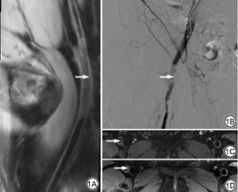 下肢动脉血栓在T1-MATRIX序列上多表现为明显高信号,部分表现为等稍低信号,在T2-MATRIX序列上信号较复杂,部分表现为高信号,部分表现为低信号(图1)。