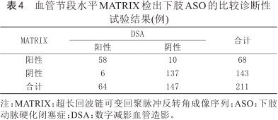 本研究结果表明,以DSA检查为参考标准,MATRIX序列在下肢动脉血栓诊断中具有较高的准确性,各项指标有效验证了MATRIX序列在下肢ASO中的诊断效能。作为一项无创性检查,MATRIX检查无电离辐射影响,不受检查者技术及经验影响,该技术无需使用对比剂,避免了对比剂不良反应发生的风险,可用于下肢动脉血栓患者的诊断及临床随访。
