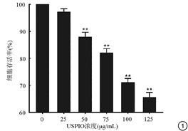 制备细胞悬液,按每孔103个细胞接种于96孔板,每孔加入100 μL培养液,次日各孔加入USPIO至终浓度分别为25、50、75、100、125 μg/mL,以0 μg/mL孔作为对照组,培养基-无细胞组作为空白对照,各组设3个复孔,常规培养24 h。按 CCK-8试剂盒说明,加入CCK-8液,37 ℃孵育1 h,用酶标仪测定波长为450 nm处细胞的吸光度(absorbance,OD),计算细胞存活率及IC50。细胞存活率=(实验组吸光度-空白组吸光度)/(对照组吸光度-空白组吸光度)×100%。IC50即细胞存活率为50%时对应的USPIO浓度。