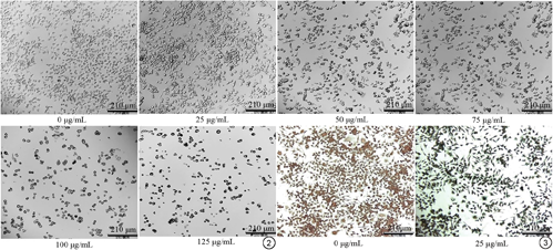 与对照组相比,光学显微镜下观察发现,当USPIO浓度为25 μg/mL时,细胞形态无明显改变;而当USPIO浓度≥50 μg/mL时,细胞明显皱缩、透光度减低(图2)。表明USPIO浓度≥50 μg/mL时,对细胞即有毒性作用。