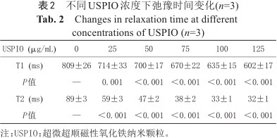 使用SPSS 23.0软件进行统计分析,测得的数据计量资料用±s表示。不同USPIO浓度下细胞存活率、弛豫时间变化分别与对照组的比较采用Dunnett-t检验;相同USPIO浓度下,弛豫时间降低率的比较采用两独立样本t检验。P<0.05表示差异有统计学意义。