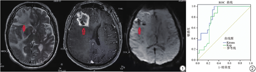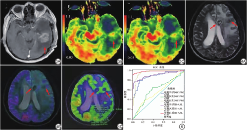 与DCE-MRI不同,DSC-PWI是测量CBF及脑血容量的标准方法,可评估肿瘤组织血管密度,能反映BG血流动力学及新生血管具体数量,与血脑屏障破坏程度、血管通透性变化无相关性[15, 16]。本研究中,DSC-PWI测量的rCBF在Ⅲ级与Ⅳ级BG间差异有统计学意义,且对BG病理Ⅳ级具有较高诊断价值,提示DSC-PWI参数能准确评估BG病理分级。考虑该结果与随着BG病理分级的升高,肿瘤体积增大、新生血管增生,使rCBF逐渐增加有关[17, 18]。