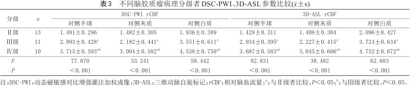 不同脑胶质瘤病理分级者DSC-PWI、3D-ASL参数比较(±s)