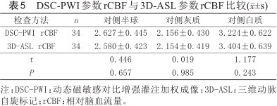 DSC-PWI与3D-ASL测量的rCBF差异无统计学意义(P>0.05),见表5。