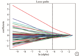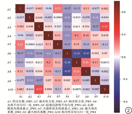 DWI和Tmax图分别提取了396个特征,通过方差分析+秩和检验后剩下272个特征,Spearman相关性检验后剩下79个特征,最后使用LASSO降维后选择的特征数为10个,特征及权重值见表2,影像组学特征的LASSO系数分布图见图1,筛选的最佳影像组学特征相关性图见图2。