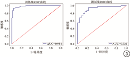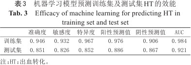 基于所得的最佳影像组学特征通过SVM分类器建立HT预测模型。应用ROC曲线分析该模型预测训练集患者HT的AUC为0.984,敏感度和特异度分别为0.932、0.967,准确度为0.946;测试集患者预测HT的AUC为0.921,敏感度和特异度分别为0.826、0.852,准确度为0.851(表3,图3)。