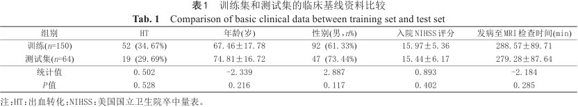 HT定义为MT术后24 h内头颅CT或MRI复查存在脑实质出血或蛛网膜下腔出血[11]。对于部分由于对比剂渗出评估较困难者,由2位有经验的诊断医师根据术前MRI及术后3~7天随访的MRI综合评估进行判断是否存在出血。采用随机分层抽样法将患者随机分为训练集150例,测试集64例。