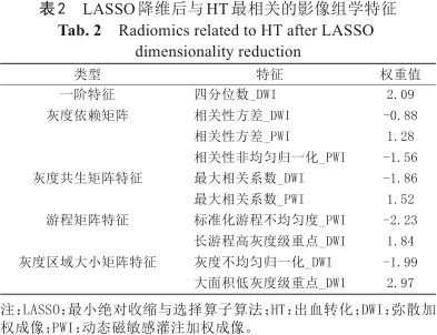 注:LASSO:最小绝对收缩与选择算子算法;HT:出血转化;DWI:弥散加权成像;PWI:动态磁敏感灌注加权成像。