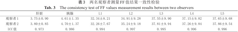 两名观察者所测数据一致性良好(组内相关系数>0.75)。IDEAL-IQ与mDixon Quant序列定量测量肝脏FF值为3.74±0.89、3.69±0.80;胰腺FF值为4.66±1.37、4.63±1.35;腰椎各节椎体FF值如下:L1为32.29±7.98、32.32±7.85;L2为35.08±9.15、35.08±9.20;L3为37.75±9.93、37.61±9.82;L4为37.15±9.82、37.26±9.84;L5为37.79±9.58、37.72±9.54,差异无统计学意义(P值均>0.05)。