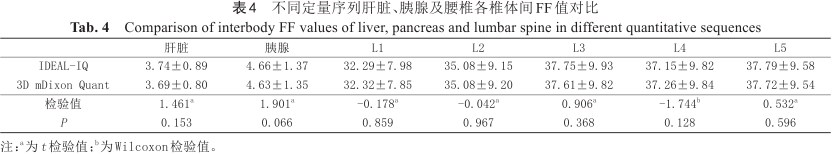 IDEAL-IQ和mDixon Quant序列扫描所获得的肝脏、胰腺及腰椎椎体(L1~L5)FF值差异均无统计学意义(P>0.05;表4,图3)。