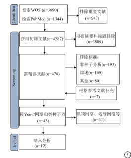 运用以上关键词进行主题检索,共检索到5234篇文献。排除重复文献947篇,根据标题、摘要排除被试非AD、MCI患者、非rsFC等3809篇,通过全文精读排除442篇(其中综述169篇,非种子点分析193篇,无对照组、无统计学意义的空间坐标等80篇)。根据以上步骤排除后剩36篇文献,通过参考文献补充了7篇文献。