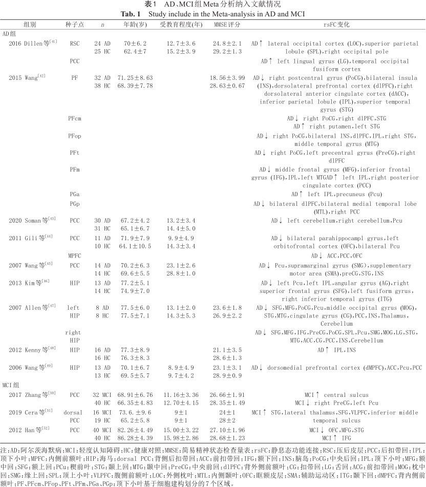 注:AD:阿尔茨海默病;MCI:轻度认知障碍;HC:健康对照;MMSE:简易精神状态检查量表;rsFC:静息态功能连接;RSC:压后皮层;PCC:后扣带回;IPL:顶下小叶;MPFC:内侧前额叶;HIP:海马;dorsal PCC:背侧后扣带回;ACC:前扣带回;IFG:额下回;INS:脑岛;PoCG:中央后回;IPL:顶下小叶;MFG:额中回;SFG:额上回;PCu:楔前叶;STG:颞上回;MTG:颞中回;PreCG:中央前回;dlPFC:背外侧前额叶;CG:扣带回;LG:舌回;ACG:前扣带回;MOG:枕中回;SMG:缘上回;SPL:顶上小叶;VLPFC:腹侧前额叶;LOC:外侧枕叶;MTL:内侧颞叶;OFC:眶额皮层;SMA:辅助运动区;ITG:颞下回;dMPFC:背内侧前额叶;PF、PFcm、PFop、PFt、PFm、PGa、PGp:顶下小叶基于细胞建构划分的7个区域。