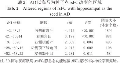 以海马为种子点,AD患者内侧前额叶(medial prefrontal cortex,MPFC) rsFC较健康对照组(healthy controls,HC)显著下降。以DMN脑区为种子点,AD患者MPFC、中央沟盖、海马和海马旁回等区域rsFC下降;MCI患者右侧后扣带回(posterior cingulate cortex,PCC) rsFC下降,而右侧中央前回rsFC增强。