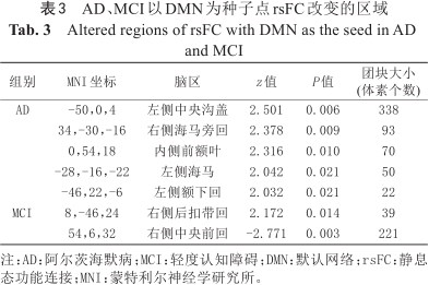 AD、MCI以DMN为种子点rsFC改变的区域