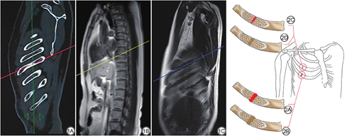 所有患者使用飞利浦(Achieva,荷兰)或西门子(Magnetom Prisma,德国) 3.0 T MRI仪和8通道相控阵腹部线圈进行扫描。采用短时反转恢复序列(short time inversion recovery,STIR)及T2预饱和脂肪抑制序列(T2-weighted spectral adiabatic inversion recovery,T2-SPAIR),且均为斜横断位扫描(图1B、1C),扫描角度可参考CT重建角度。飞利浦MRI仪扫描参数如下:(1) STIR序列,重复时间(repetition time,TR)=2182 ms,回波时间(echo time,TE)=60 ms,图像视野(field of view,FOV)=35.0 cm×42.2 cm,层厚3.0 mm,层间距3.0 mm,平静呼吸扫描,时间5 min;(2) T2-SPAIR序列,TR=1100 ms,TE=70 ms,FOV=40.0 cm×35.6 cm,层厚3.0 mm,层间距3.0 mm,屏气扫描,分3次完成,共需45 s。西门子MRI仪扫描参数如下:(1) STIR序列,TR=2740 ms,TE=65 ms,FOV=40.0 cm×32.4 cm,层厚3.0 mm,层间距3.0 mm,平静呼吸扫描,时间5 min;(2) T2-SPAIR序列,TR=2530 ms,TE=73 ms, FOV=40.0 cm×30.0 cm,层厚3.0 mm,层间距3.0 mm,屏气扫描,分3次完成,共需45 s。首先用STIR序列从胸廓开口扫描至第12肋骨下缘,然后确定肋骨骨折的范围,最后根据确定的范围进行T2-SPAIR序列的扫描。若骨折范围大,T2-SPAIR序列可分两次进行扫描。一位患者可在10 min内扫描完成。