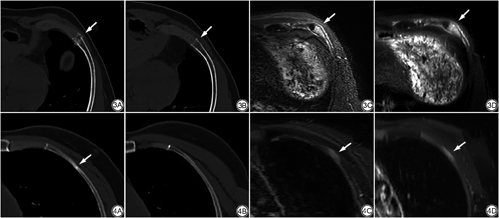 细微肋骨骨折分为两型,Ⅰ型为骨皮质断裂伴骨痂形成,MRI上表现为骨髓水肿伴骨膜下积液;Ⅱ型为骨皮质显示完整伴有骨内骨痂形成,MRI上仅有骨髓水肿。复查CT共确诊91处细微肋骨骨折,其中Ⅰ型骨折共86处(占94.51%),Ⅱ型骨折共5处(占5.49%)。MRI检查共诊断90处骨折,3处为假阳性,其诊断准确率为92.55%,敏感度为95.60%,其中Ⅰ型骨折共85处(3处假阳性),在压脂序列上表现为“三明治”征,即内层为高信号的骨髓水肿影,中层为低信号的骨皮质,外层为高信号的骨膜下积液;Ⅱ型骨折共5处,在压脂序列上表现为高信号的骨髓水肿影,无骨膜下积液。首次CT检查发现55处骨折,全部为Ⅰ型骨折,诊断准确率及敏感度均为60.44%。MRI与首次CT检查检出的骨折数量差异有统计学意义(P=0.027)。