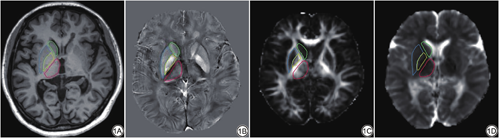 WM-LV在3D-FLAIR序列中测量,由2名5年以上MR研究经验的医师基于ITK-SNAP (Version 3.8;http://www.itksnap.org/pmwiki/pmwiki.php)软件在RRMS患者的3D-FLAIR序列上逐层勾画白质病灶测得体积,重复勾画两次,其体积通过组内相关系数检验(ICC=0.963,P<0.001),取平均值为该患者WM-LV;基于MATLAB R2013b (Version 8.2.0.701)平台的SPM 8 (Version 6313;https://www.fil.ion.ucl.ac.uk/spm/software/spm8/)的VBM对3D-T1WI数据进行预处理,随后基于REST软件,以双侧尾状核、壳核、苍白球、丘脑为感兴趣区(region of interest,ROI) (图1A),提取各核团体积。