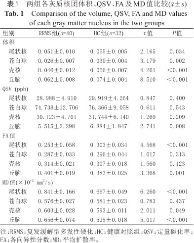 前瞻性纳入40例RRMS患者和32例健康对照(healthy controls,HC)组,行3D-T1WI、3D-液体衰减反转恢复(fluid attenuated inversion recovery,FLAIR)、定量磁敏感图(quantitative sensitivity mapping,QSM)和扩散张量成像(diffusion tensor imaging,DTI)扫描,获得灰质核团体积、定量磁化率值(quantitative susceptibility value,QSV)、各向异性分数(fractional anisotropy,FA)和平均扩散率(mean diffusivity,MD)值及白质病灶体积(white matter lesion volume,WM-LV)。独立样本t检验比较组间灰质核团体积、QSV、FA和MD值差异,相关分析评估核团各指标与扩展残疾状态量表(Expanded Disability Status Scale,EDSS)评分及WM-LV的相关性。