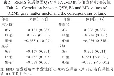 RRMS灰质核团QSV和FA、MD值与相应体积相关性