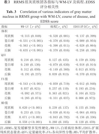 RRMS组各灰质核团参数与白质病灶相关分析显示:各核团体积均与WM-LV呈显著负相关(P均<0.05),尾状核FA值与其呈显著负相关,伴尾状核、壳核、丘脑MD值与其呈显著正相关(P均<0.01),余FA及MD值与其无显著相关性(P均>0.05);同时,核团QSV与WM-LV均无显著相关性(P均>0.05),见表3。
