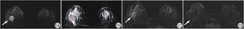 由2名经验丰富的放射科医师(具有3年MRI诊断经验的医师和20年MRI诊断经验的副主任医师)在西门子后处理工作站Syngo.via(20A.HF06版本)上采用双盲法独立分析MRI图像,意见不一致时协商解决。在MRI图像上观察腋窝淋巴结特征。MRI诊断淋巴结转移的依据:(1)短径/长径>0.6;(2)脂肪门消失;(3)淋巴结强化明显;(4)皮髓质界限不清。如果出现以上四项中的一项,则认为MRI淋巴结阳性。最大密度投影(maximal intensity projection, MIP)图上观察肿瘤周围血管征象,如果瘤周血管增多增粗则为周围血管征阳性。在肿瘤最大层面强化最明显处勾画感兴趣区(region of interest, ROI),避开囊变坏死及出血区域。ROI取值控制在20 mm2,自动生成时间信号强度曲线(time-signal intensity curves, TIC)。DWI图像经工作站后处理获得表观扩散系数(apparent diffusion coefficient, ADC)图,定位肿瘤最大层面,勾画一个ROI,尽量避开囊变坏死及出血区域,得到肿瘤ADC平均值(mean values of tumor ADC, ADCtmean),然后选择肿瘤周围2 mm内临近乳腺实质组织ADC值最高处(视觉感知)勾画三个ROI,测量其ADC值,记录瘤周最大ADC值(peritumoral maximum ADC, ADCpmax)。计算肿瘤ADC值差值(difference of tumor ADC, ADCtdiff)和瘤周-肿瘤ADC比值(ratio of peritumoral-tumor ADC, ADCratio)。计算公式如下:ADCtdiff=肿瘤最大ADC值-肿瘤最小ADC值;ADCratio=ADCpmax/ADCtmean(图1)。所有数据测量三次,取其平均值。