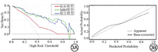 Delong结果显示,联合预测模型的AUC值高于临床预测模型(P=0.002),但是与MRI预测模型的AUC差异不显著(P=0.200)。MRI预测模型的AUC高于临床预测模型(P=0.010)。DCA表明联合预测模型具有良好的临床效益,校准曲线表明联合预测模型评估ALNM效能良好(图3)。