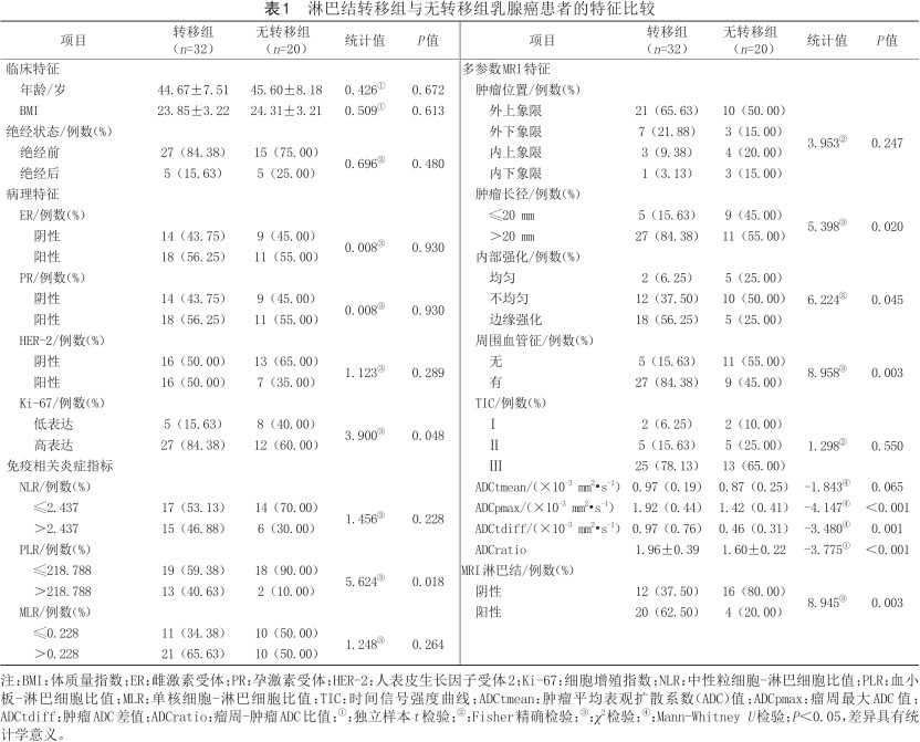 注:BMI:体质量指数;ER:雌激素受体;PR:孕激素受体;HER-2:人表皮生长因子受体2;Ki-67:细胞增殖指数;NLR:中性粒细胞-淋巴细胞比值;PLR:血小板-淋巴细胞比值;MLR:单核细胞-淋巴细胞比值;TIC:时间信号强度曲线;ADCtmean:肿瘤平均表观扩散系数(ADC)值;ADCpmax:瘤周最大ADC值;ADCtdiff:肿瘤ADC差值;ADCratio:瘤周-肿瘤ADC比值;①:独立样本t检验;②:Fisher精确检验;③:χ2检验;④:Mann-Whitney U检验;P<0.05,差异具有统计学意义。
