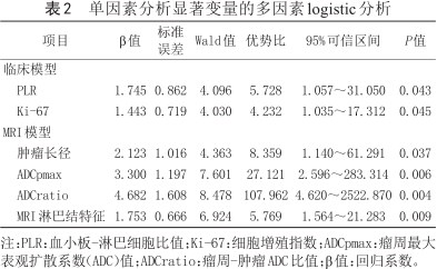 对乳腺癌淋巴结转移组与无转移组间临床特征、病理特征、免疫炎症指标及多参数MRI特征进行单因素分析。根据Youden指数计算NLR、PLR和MLR最佳临界值分别为2.437、218.788和0.228。单因素分析表明,Ki-67表达、PLR、肿瘤长径、周围血管征、内部强化方式、ADCtdiff、ADCpmax、ADCratio及MRI淋巴结特征差异具有统计学意义(P<0.05),见表1。将单因素分析有意义的结果进一步采用多因素logistic回归向前步进法分析,结果显示Ki-67、PLR、肿瘤长径、ADCpmax和ADCratio、MRI淋巴结特征是预测乳腺癌腋窝淋巴结转移的独立影响因素(P<0.05)(表2)。