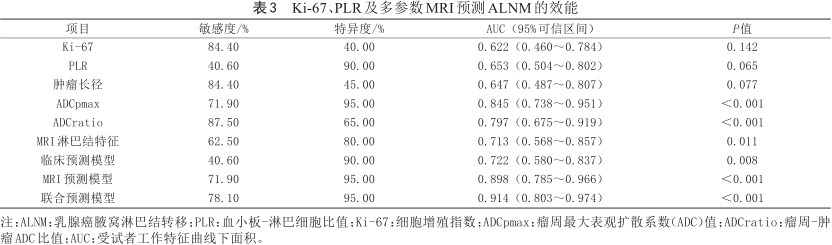 Ki-67、PLR及多参数MRI预测ALNM的效能