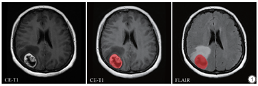 首先将T2-FLAIR图像通过FSL软件(http://fsl.fMRIb.ox.ac.uk/fsl/fslwiki/FSL)采用仿射变换与相应的CE-T1图像进行配准。肿瘤感兴趣区(region of interest, ROI)的勾画利用ITK-SNAP软件(http://www.itksnap.org)进行。由两名年资在10年以上的放射科主治医生进行双盲手动勾画,重叠区作为肿瘤的感兴趣区。并最终由一名年资超过20年的放射科主任医生审验。在CE-T1 MRI的图像上勾画出ROI,然后配准到T2-FLAIR图像上(图1)。