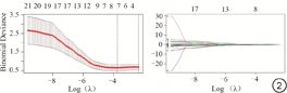 首先,使用Z-score变换对训练集的影像组学特征进行标准化,单因素逻辑回归(logistic regression, LR)进行特征初筛,P<0.05表示特征具有统计学意义。然后使用最小绝对收缩和选择算法(least absolute shrinkage and selection operator, LASSO)回归进一步进行特征选择,通过10-fold交叉验证选择最佳参数λ,在其值最小时选择系数非零的影像组学特征。由于数据集的构成比差异明显,为提高训练模型的准确性,使用合成少数过采样技术(synthetic minority over-sampling technique, SMOTE)方法对训练集少数类样本进行平衡化,再采用多因素LR进行建模。通过训练集和测试集的受试者工作特征(receiver operating characteristic curve, ROC)曲线以及校准曲线,对模型性能和拟合优度进行检验。绘制列线图进行可视化风险预测。
