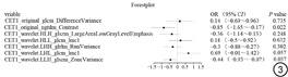 训练集经过单因素LR,仅CE-T1序列保留了21个放射组特征,T2-FLAIR序列为0。为了选择最佳的影像组学特征和解决过拟合问题,采用LASSO算法。最终,在λ值最小时,有7个系数不为零的特征被保留(图2)。经SMOTE数据平衡(阳性和阴性样本例数为99∶99),使用多因素LR建立影像组学模型(图3)。