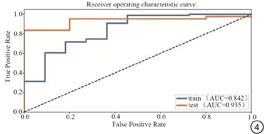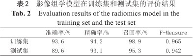 影像组学模型在训练集和测试集的曲线下面积(area under the curve, AUC)值分别为0.842和0.935(图4)。在训练集的准确率为93.6%、精确率为94.2%、召回率为98.9%、F-Measure为0.965;在测试集的准确率为89.6%、精确率为93.1%、召回率为95.3%、F-Measure为0.942(表2)。