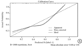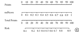 训练集的校准曲线显示了影像组学模型和实际结果有着较好的一致性,经Hosmer-Lemeshow检验的P值为0.1393(图5),测试集因为数据过少、且构成比的差异显著,R语言的glm和lrm函数无法拟合模型,因此无法生成校准曲线。根据模型计算的影像组学评分(radiomics score, Radscore),我们还绘制了列线图用于风险预测(图6)。