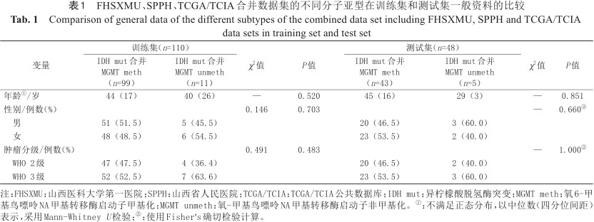 根据IDH mut状态下MGMT启动子的是否发生甲基化,将LGGs分为IDH mut合并MGMT meth亚型、IDH mut合并氧6-甲基鸟嘌呤DNA甲基转移酶启动子非甲基化(O6-methylguanine-DNA methyltransferase promoter unmethylation, MGMT unmeth)亚型(该亚型简写为:IDH mut合并MGMT unmeth亚型)。由于两种分子亚型的构成比明显不均衡,为提高模型泛用性,将FHSXMU数据、SPPH数据和TCGA/TCIA数据进行整合,然后以7∶3比例随机分为训练集和测试集。统计分析采用R软件4.1.2版本(www.R-project.org)和SPSS软件23.0版本(https://www.ibm.com/analytics/spss-statistics-software)实现。