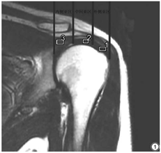 扫描完成后由2名具有10年以上骨肌系统疾病诊断经验的放射科医师独立阅片,采用盲法评价图像并纳入肌腱炎病例,意见不同时经协商达成一致。另外使用GE主机MAGiC处理软件包进行图像后处理,生成T1 mapping、T2 mapping 和PD mapping 3组定量图谱。于Magic序列生成的T2WI斜冠状位图像上将冈上肌肌腱分为外侧亚区(指冈上肌肌腱纤维远侧插入部位)、中间亚区(指外侧部位和内侧部位连线的中点部位)及内侧亚区(指位于外侧部位内侧方向2 cm左右、高于肱骨头软骨的区域)[17],如图1所示。根据肌腱的走形分别于3个亚区勾画感兴趣区(region of interest, ROI),勾画时避开脂肪及周围其他组织,ROI的勾画及测量分别由前2名放射科医师(观察者1和2)独立完成,并在间隔至少2周后重复测量数据,以评估观察者间和观察者内的一致性,最终的分析数据为2名医师4次测量结果的平均值。