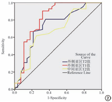 本研究结果发现发生冈上肌肌腱炎时肌腱外侧及中间亚区的T2值明显增高。由于外侧亚区主要是肱骨大结节附着处的肌腱,且该部位为明显的“乏血管区”[19],以胶原蛋白为主要组成成分,当附着处肌腱由炎性浸润、水肿发展至纤维蛋白分子结构破坏、肌腱充血变性甚至脂肪浸润时,T2弛豫时间明显延长,T2值增高,这种弛豫时间的差异反映了T2值对胶原纤维在肌腱内部的方向、磁场中的方向以及水含量等反映肌腱生理特点的标志物非常敏感,这与既往研究结果相似[20, 21, 22]。另外本研究发现发生肌腱炎时外侧亚区的T1值也显著增高。T1弛豫时间最初用于急性脑缺血事件后心肌纤维化的无创评估[23],已有多项研究将该技术应用于肌腱相关病变的评估,国外研究文献报道表明T1弛豫时间可作为一种生物标志物区分健康和病理性肌腱[24, 25]。本研究发现发生肌腱炎时冈上肌肌腱外侧亚区的T1值显著增高,且对肌腱炎的诊断效能较高,这进一步证明了T1弛豫时间可反映慢性冈上肌肌腱炎的纤维化、脂肪浸润及组织水肿等改变[26],随着病程的不断进展,肌腱发生纤维化及脂肪浸润愈发显著,T1值明显增高。