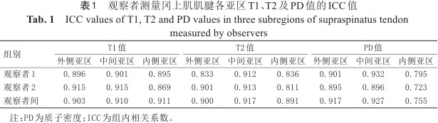冈上肌肌腱三个亚区T1、T2及PD值测量结果一致性分析发现,外侧亚区的ICC值较高,其次是中间亚区,最后是内侧亚区,除观察者2的PD值观察者内ICC值为0.723外,其余ICC值均>0.75(表1)。