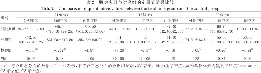 肌腱炎组外侧亚区的T1及T2值、中间亚区的T2值均高于对照组,差异有统计学意义(P<0.05);肌腱炎组外侧亚区的PD值、中间亚区的T1及PD值与对照组差异无统计学意义(P>0.05);肌腱炎组内侧亚区的T1、T2及PD值与对照组差异均无统计学意义(P>0.05)(表2)。