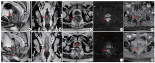 直肠癌nCRT后,瘤床区域病理变化复杂,包括炎性反应、纤维化、黏液变性、水肿等,于T2WI图像表现为混杂信号,难以区分,这就决定了基于T2WI的mrTRG评估存在很多不确定性[11]。反应良好的患者中,肿瘤坏死纤维化,主要表现为T2WI序列信号降低,但纤维化内仍可能存在少量肿瘤,常规T2WI序列无法准确分辨。