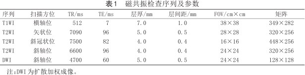 | 序列 | 扫描方位 | TR/ms | TE/ms | 层厚/mm | 层间距/mm | FOV/cm×cm | 矩阵 |
