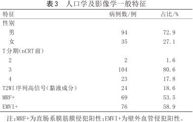 本研究经过天津市人民医院学术伦理委员会批准,免除受试者知情同意,批准文号:2022B15。回顾性分析2017年10月至2021年6月期间天津市人民医院肛肠诊疗中心收治的局部进展期中低位直肠癌患者病例129例。病例纳入标准:(1)距肛门10 cm以内、经病理确诊的直肠腺癌;(2)术前MRI评估为局部进展期直肠癌(cT3~4和/或cN+);(3)完成常规长程新辅助同步放化疗;(4)心、肝、肾功能及凝血功能正常;(5)放化疗完成后接受根治性手术。病例排除标准:(1)MR图像存在较为严重伪影;(2)治疗前及治疗过程中影像学检查发现肝、肺等远处转移。