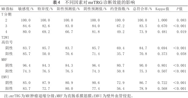 分层分析结果显示,mrTRG的敏感度、特异度、阳性预测值、阴性预测值、约登指数、总符合率随着T分期升高而减低。T2WI高信号、MRF+、EMVI+使mrTRG的敏感度、特异度、阳性预测值、阴性预测值、约登指数、总符合率不同程度减低(T2WI高信号对敏感度的影响除外),具体见表4。