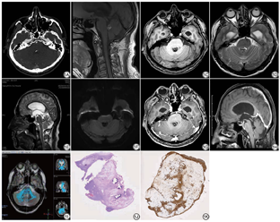 患者男,59岁,自诉于一周前无明显诱因出现头晕、头痛,呈间断性胀痛,头昏沉感,头晕时感天旋地转,同时伴黑蒙,偶感恶心,无明显呕吐,坐立时头晕能缓解,1天前再次出现头晕表现,随后摔倒,于2022年3月7日来我院就诊。专科检查:患者神志清,精神不佳,语言缓慢,理解能力正常,双侧瞳孔等大。实验室检查:大生化γ球蛋白19%,A/G 1.22。既往史:慢性胃炎、食管炎病史,口服奥美拉唑胶囊。头颅CT血管造影(CT angiography, CTA)检查示第四脑室内可见多个点状钙化影(图1A)。头颅MRI检查示第四脑室可见一结节样异常信号,大小约11 mm×8 mm,边界清楚,形态欠规整,与小脑蚓部及脑干关系密切,T1WI呈高信号,其内可见斑点状低信号(图1B),T1WI压脂呈等低信号(图1C),T2WI呈高低混杂信号,周围可见脑脊液环绕(图1D~1E),扩散加权成像(diffusion-weighted imaging, DWI)呈低信号(图1F),双侧侧脑室、第三脑室扩大,增强扫描后第四脑室病变强化不明显(图1G~1H),波谱成像病变区Cho峰、NAA峰未见明显升高,纤维束成像第四脑室内未见纤维束走形(图1I),周围纤维束环绕,未见中断及推移。MRI诊断为第四脑室占位性病变并梗阻性脑积水,考虑:室管膜瘤、脑膜瘤。手术记录:2022年3月17日在我院行第四脑室占位切除术,术中见第四脑室内11 mm×8 mm大小的肿瘤组织,质地硬,包膜完整,内有钙化,与小脑蚓部及脑干关系密切,完整切除肿瘤组织。组织病理检查:肿瘤组织由纤维脂肪及少量短梭形及类圆形的细胞组成,间质有钙化,罗氏染液做免疫组化协诊(图1J)。结合免疫组化结果,病变符合小脑脂肪神经细胞瘤。免疫组化:NeuN(+)、Olig-2(散在+)、GFAP(+)、EMA(-)、PR(-)、CD34(-)、STAT6(-)、Ki-67阳性率约1%(图1K)。