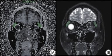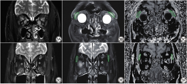 采用德国Siemens 3.0 T Skyra磁共振扫描仪和20通道头颈联合线圈。在眼眶MRI扫描过程中,嘱患者闭眼以减少眼球运动。常规MRI序列包括轴位、冠状位及斜矢状位FS-T2WI以及轴位T1WI。常规MRI序列具体参数如下:(1)冠状位FS-T2WI序列,TR 4000 ms,TE 75 ms,矩阵224×320,层厚3.5 mm,层数18层;(2)轴位FS-T2WI序列,TR 4000 ms,TE 79 ms,矩阵320×320,层厚3.0 mm,层数20层;(3)斜矢状位FS-T2WI序列,TR 4000 ms,TE 79 ms,矩阵346×384,层厚3.5 mm,层数17层;(4)轴位T1WI序列,TR 635 ms,TE 6.7 ms,矩阵320×320,层厚3.0 mm,层数20层。MTI采用冠状位三维梯度回波序列,在完全相同的位置及参数下,分别施加和不施加预饱和脉冲扫描两次。具体参数:TR 27 ms,TE 3.63 ms,矩阵192×192,层厚4 mm,层数20。