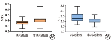 泪腺各定量参数测量的观察者内及观察者间一致性均为优(ICC:0.805~0.903)。活动期组泪腺MTR低于非活动期组,SIR高于非活动期组,两者差异均具有统计学意义(P<0.001,表1,图2)。活动期与非活动期TAO患者各一例影像图像见图3。